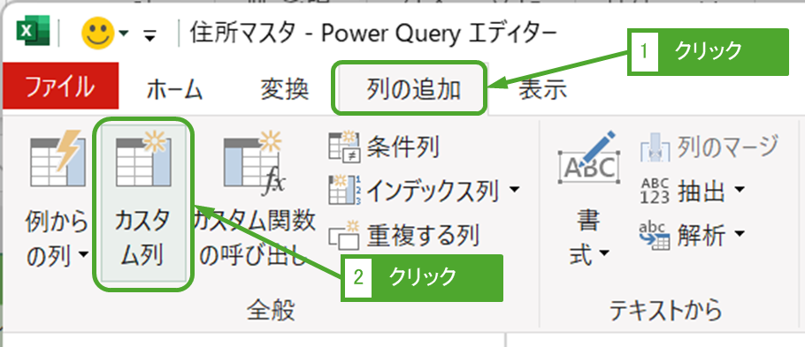 Power Queryエディターを開き、「列の追加」タブー「カスタム列」をクリックします。