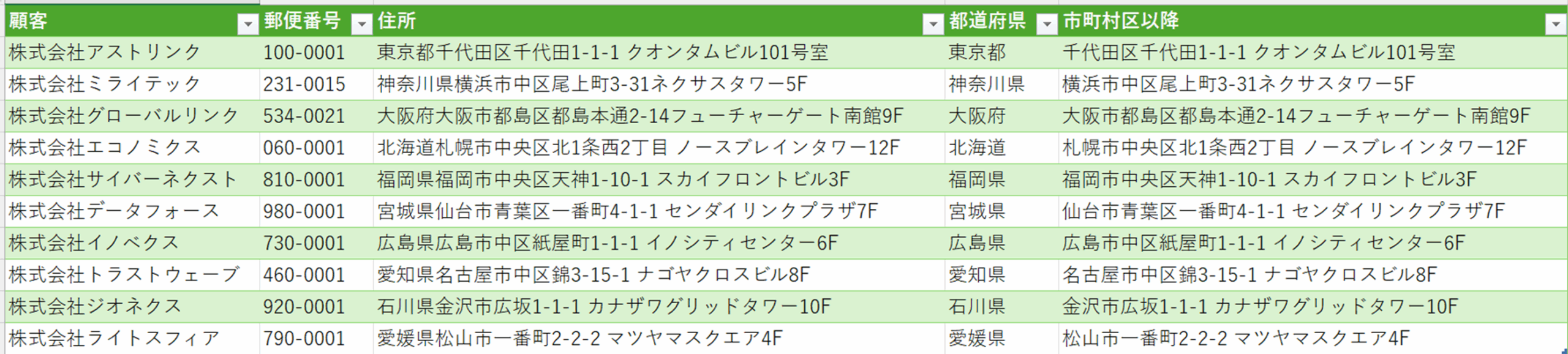 冒頭でも記載した、顧客、郵便番号、住所列があるサンプルデータを使用します。