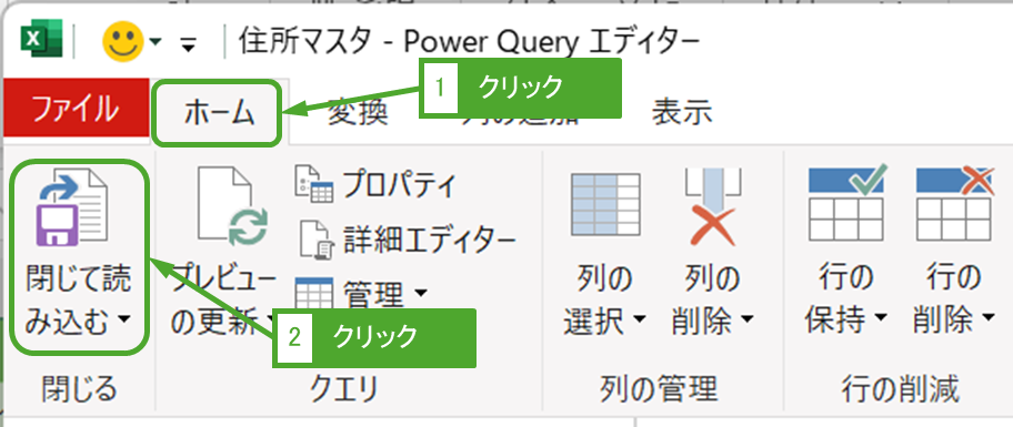 データの加工が終わったため、「ホーム」タブー「閉じて読み込む」をクリックします。
