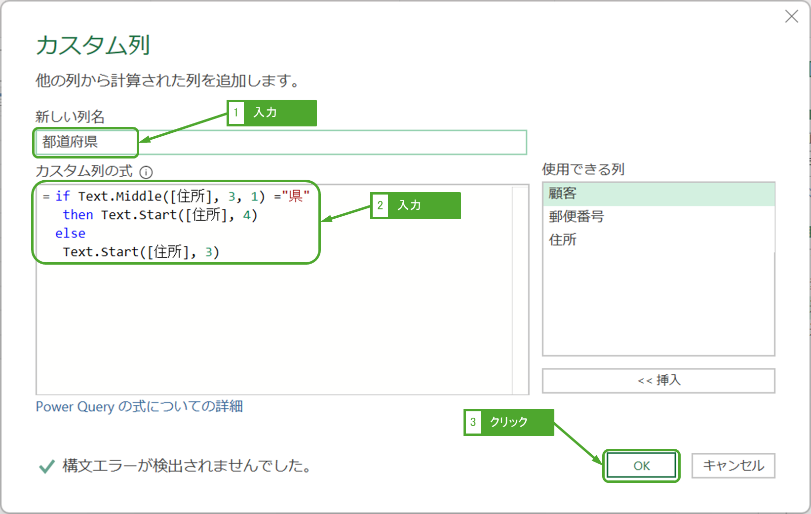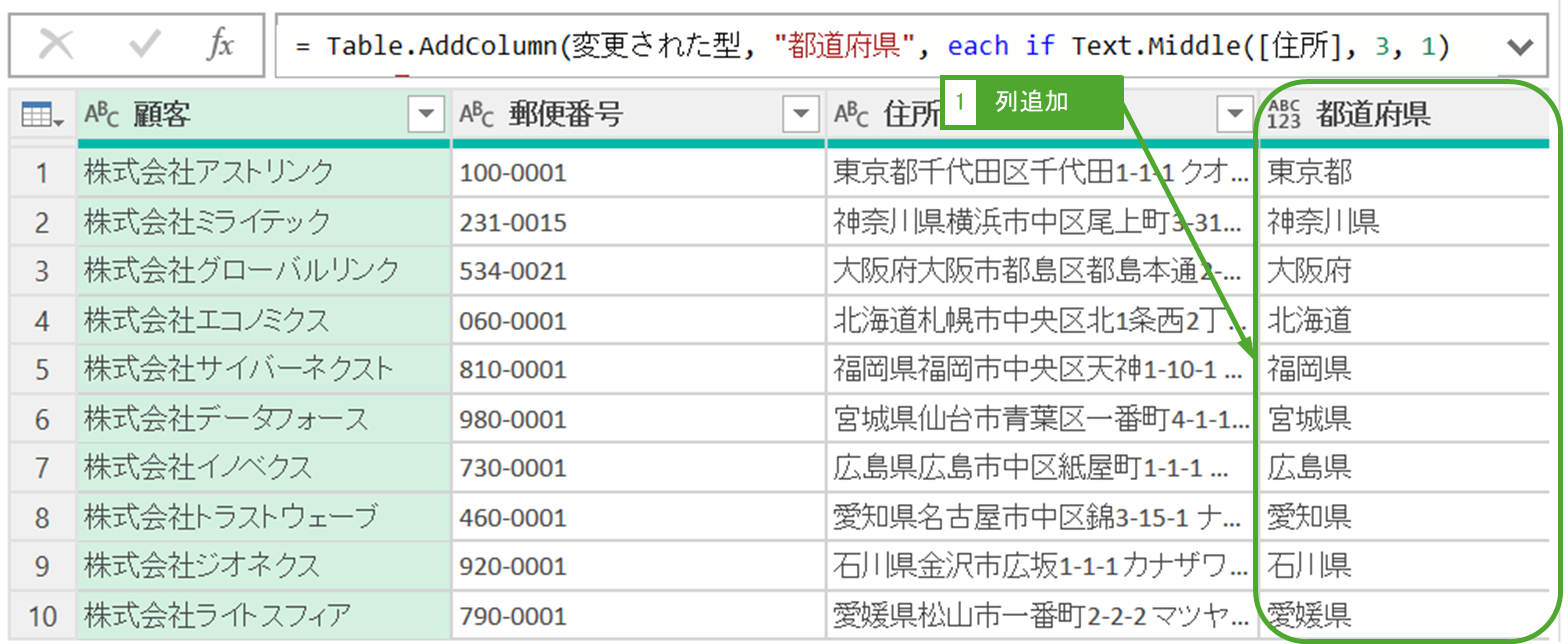 else Text.Start([住所], 3) で3文字の都道府県を取得しています。
