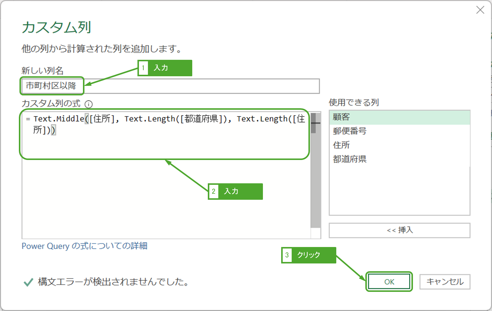 「新しい列名」に「市町村区以降」と入力、「カスタム列の式」に後述の変換式を入力し、OKをクリックします。