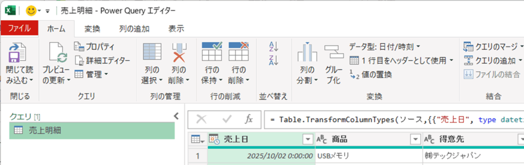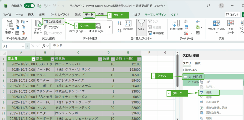 サンプルデータをダウンロードして、「データ」タブー「クエリと接続」をクリックします。「売上明細」を右クリックし、「編集」をクリックします。