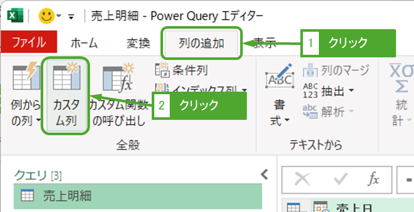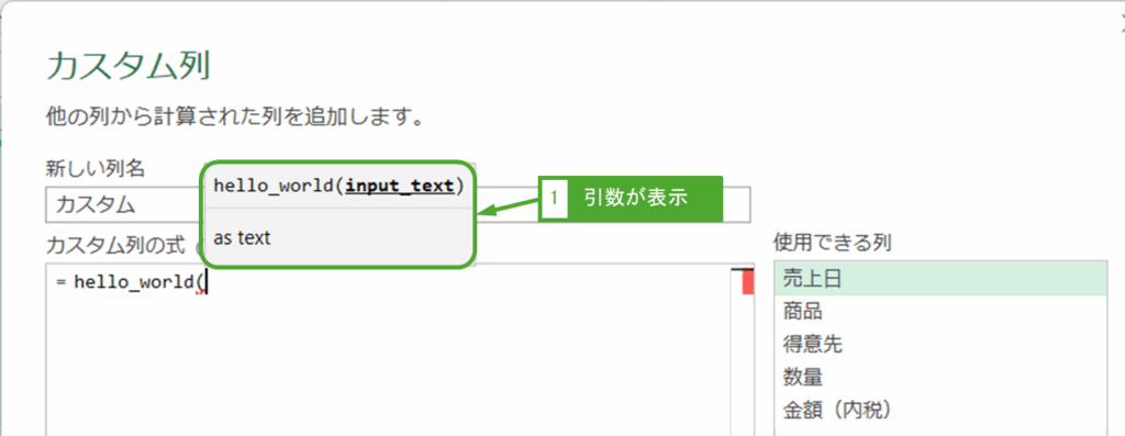 作成したカスタム関数は、他の数式で使用できます。試しに使ってみるために、カスタム列を追加します。
