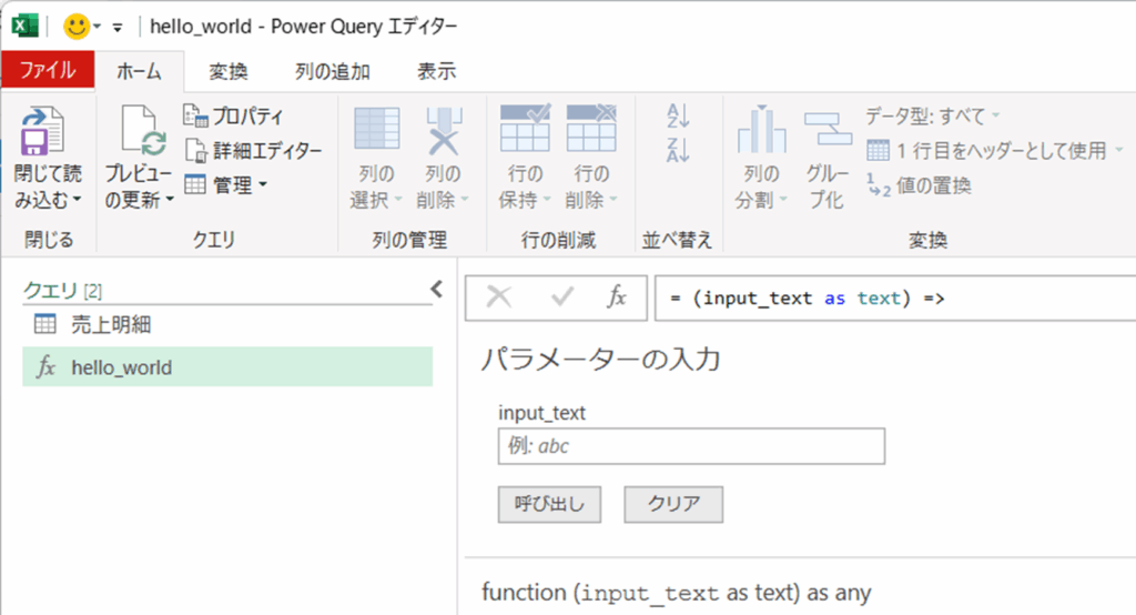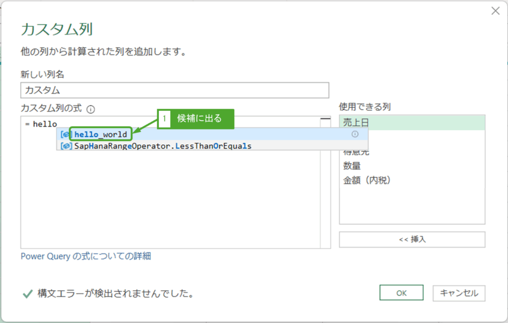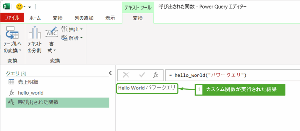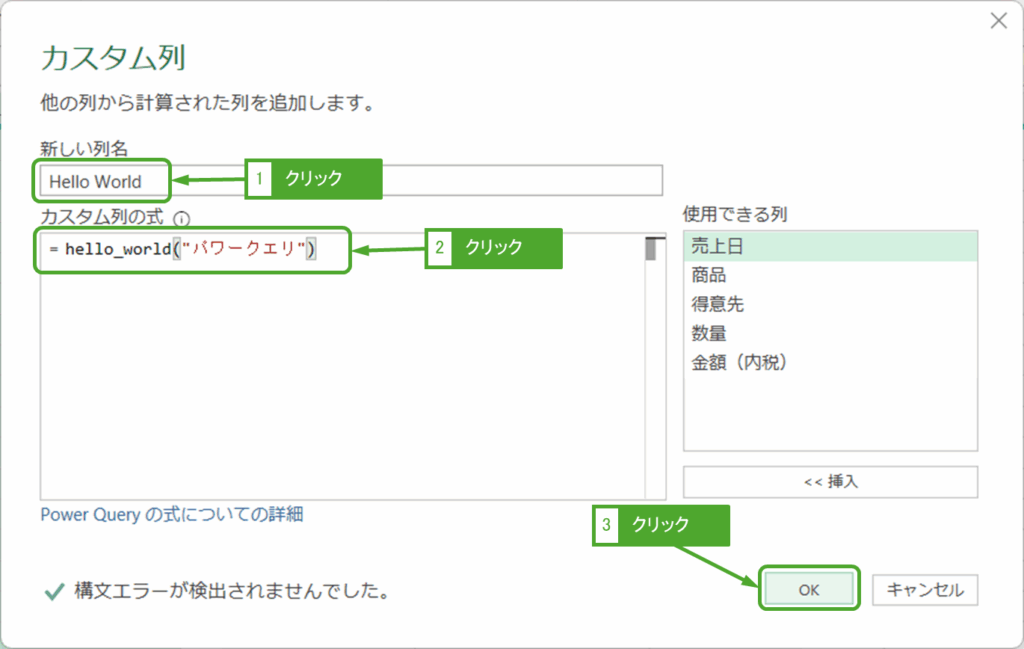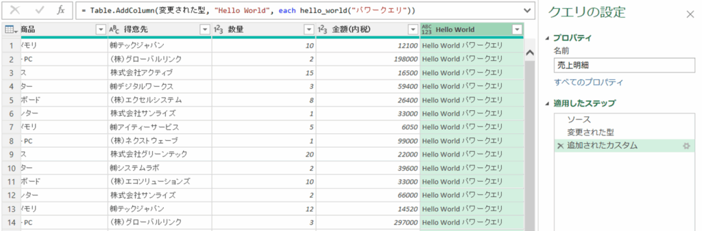 「新しい列名」に「Hello World」、「カスタム列の式」に「hello_world(“パワークエリ”)」と入力し、OKをクリックします。