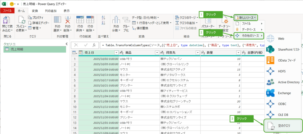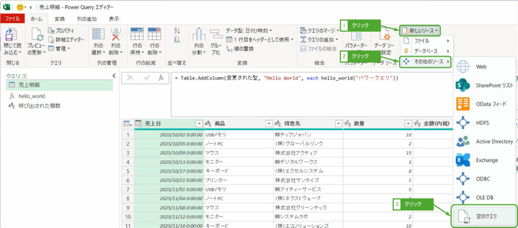 Hello Worldの時と同様に、「ホーム」タブー「新しいソース」ー「その他のソース」ー「空のクエリ」をクリックします。