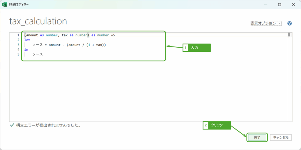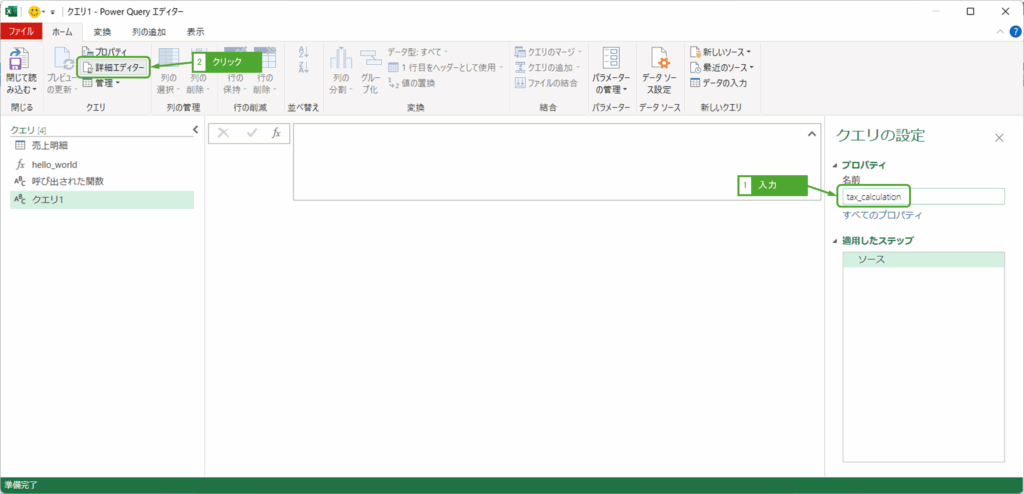 「クエリの設定」ー「プロパティ」ー「名前」に「tax_calculation」と入力し、「詳細エディター」をクリックします。