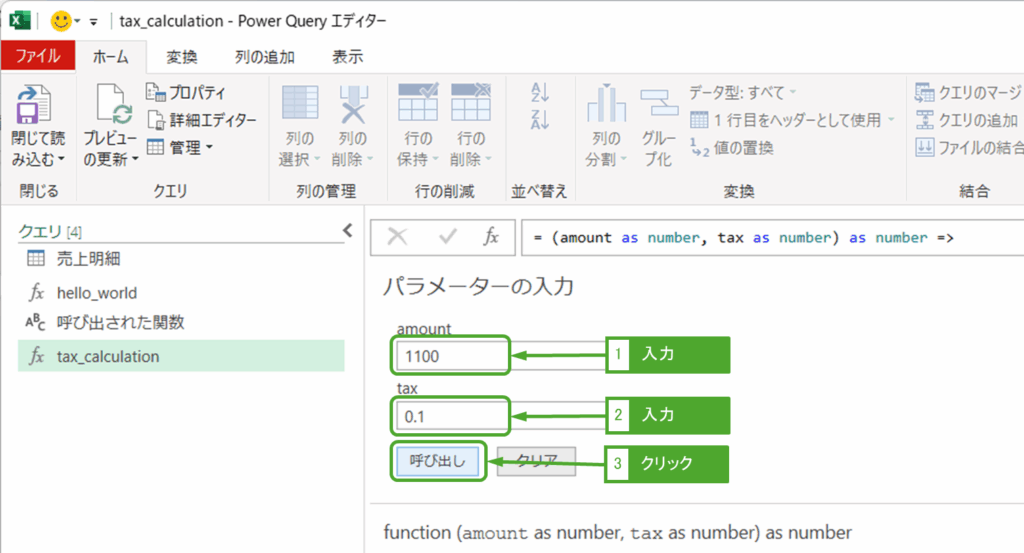 「input_text」に「1100」、「tax」に「0.1」と入力し、「呼び出し」をクリックします。