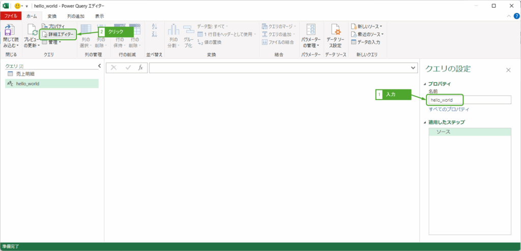 「クエリの設定」ー「プロパティ」ー「名前」に「hello_world」と入力し、「詳細エディター」をクリックします。