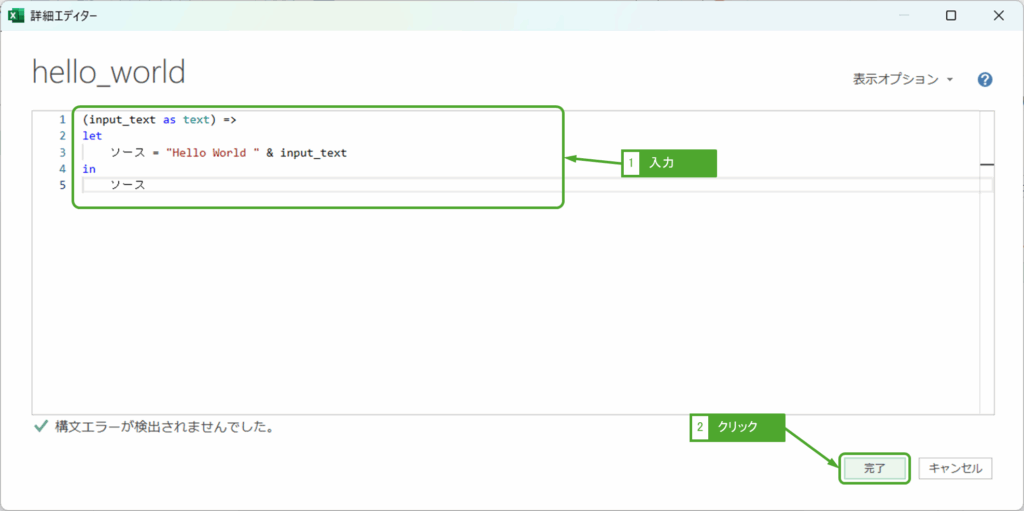 まず初めに:Hello World 〇〇〇と出力するカスタム関数を作成する