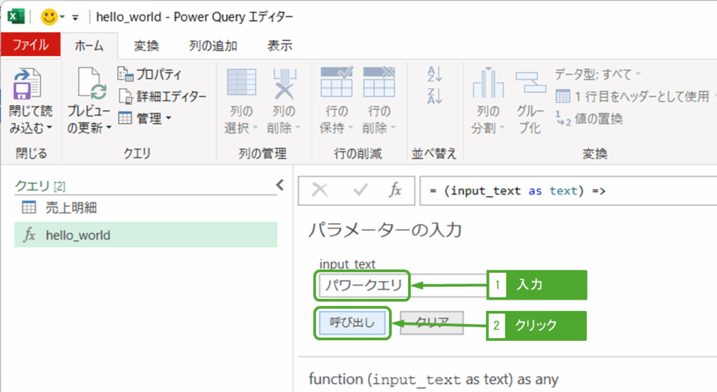 「input_text」に「パワークエリ」と入力し、「呼び出し」をクリックします。