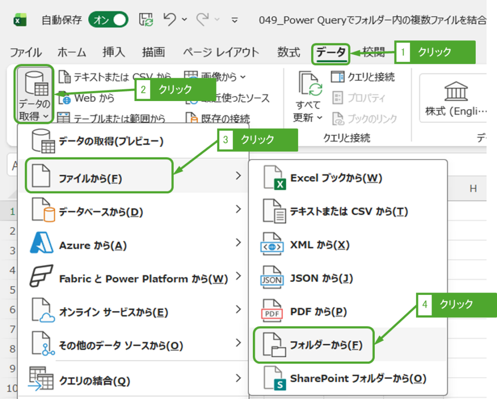 「ホーム」タブー「データの取得」ー「ファイルから」ー「フォルダーから」をクリックします。