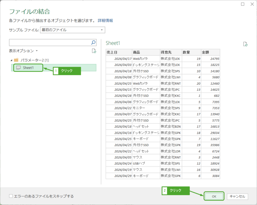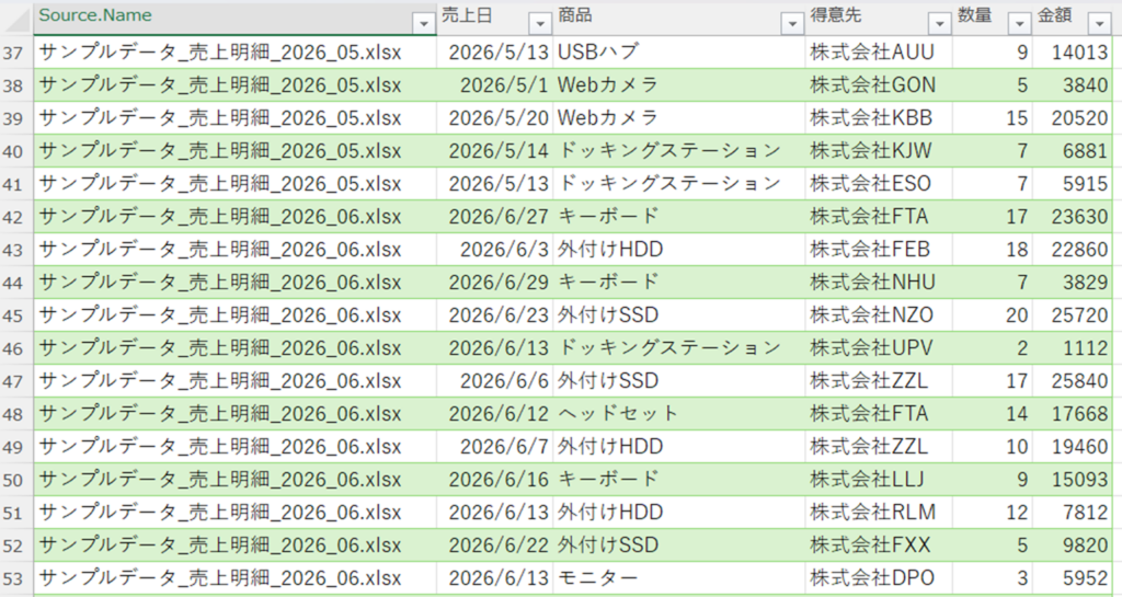 サンプルデータとして月ごとの売上明細データを使います。2026年4月、5月、6月の3ファイルあります。各ファイルは同じ列構成(日付、商品、得意先、数量、金額)で、列の並び順や列名を一致させています。