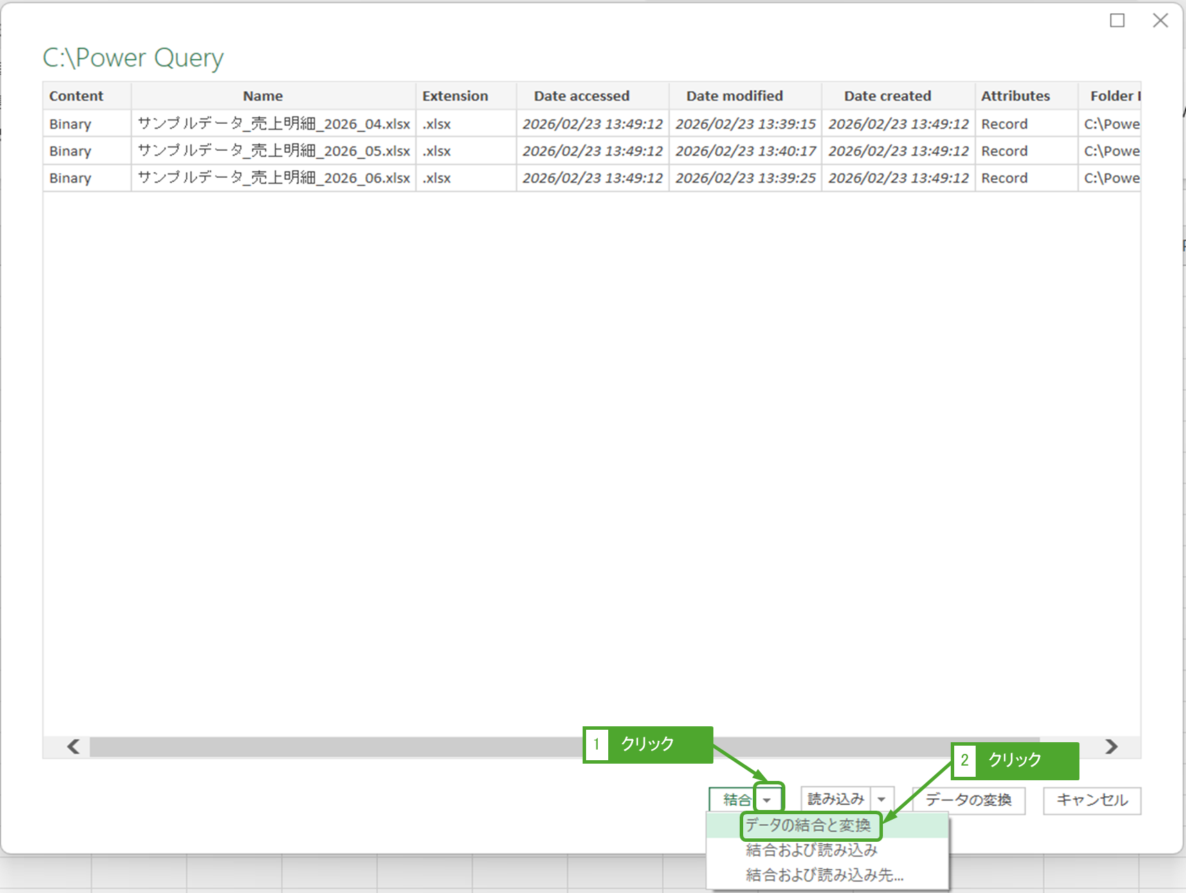 この操作により、Power Queryが自動的にファイルを結合するためのM言語の式を生成します。