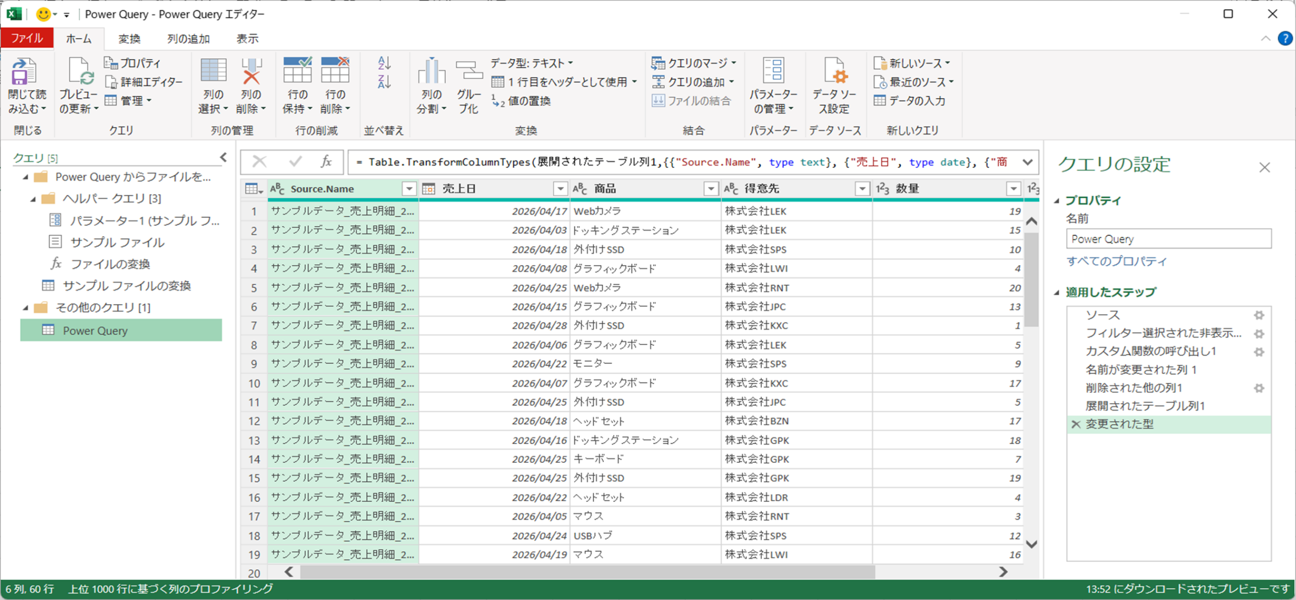データの一番左側には、「Source.Name」という名前の列が自動的に生成されています。この列には元のファイル名が記載されていますが、分析に不要な場合は削除が可能です。