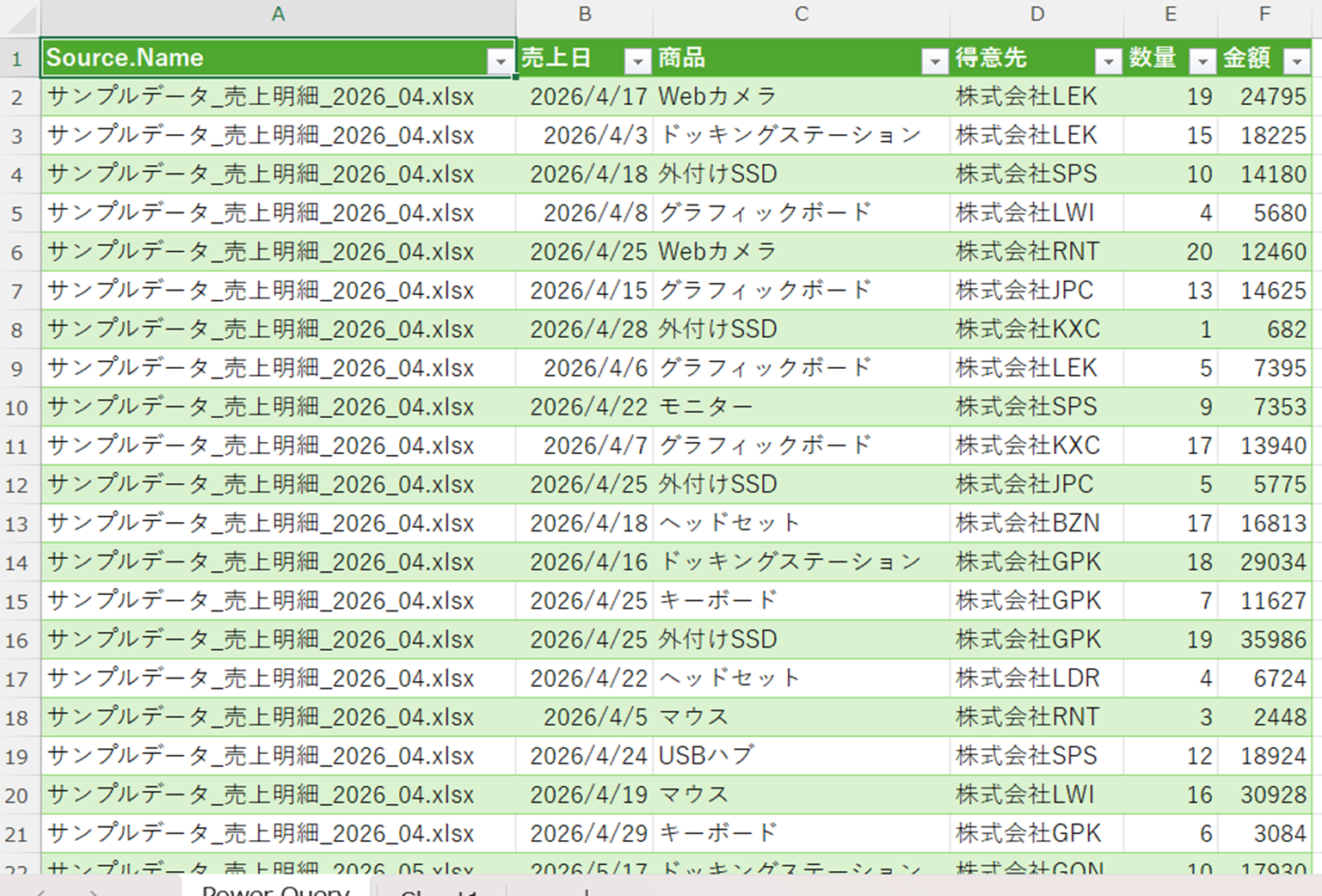 サンプルデータとして月ごとの売上明細データを使います。2026年4月、5月、6月の3ファイルあります。各ファイルは同じ列構成(日付、商品、得意先、数量、金額)で、列の並び順や列名を一致させています。