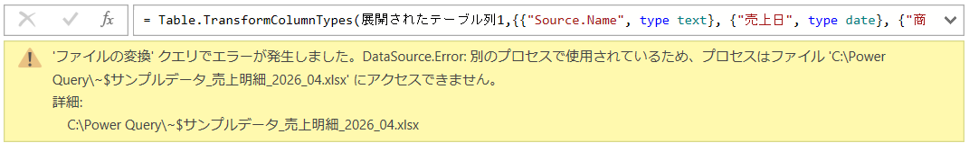 'ファイルの変換' クエリでエラーが発生しました。DataSource.Error: 別のプロセスで使用されているため、プロセスはファイル 'C:\Power Query\~$サンプルデータ_売上明細_2026_04.xlsx' にアクセスできません。