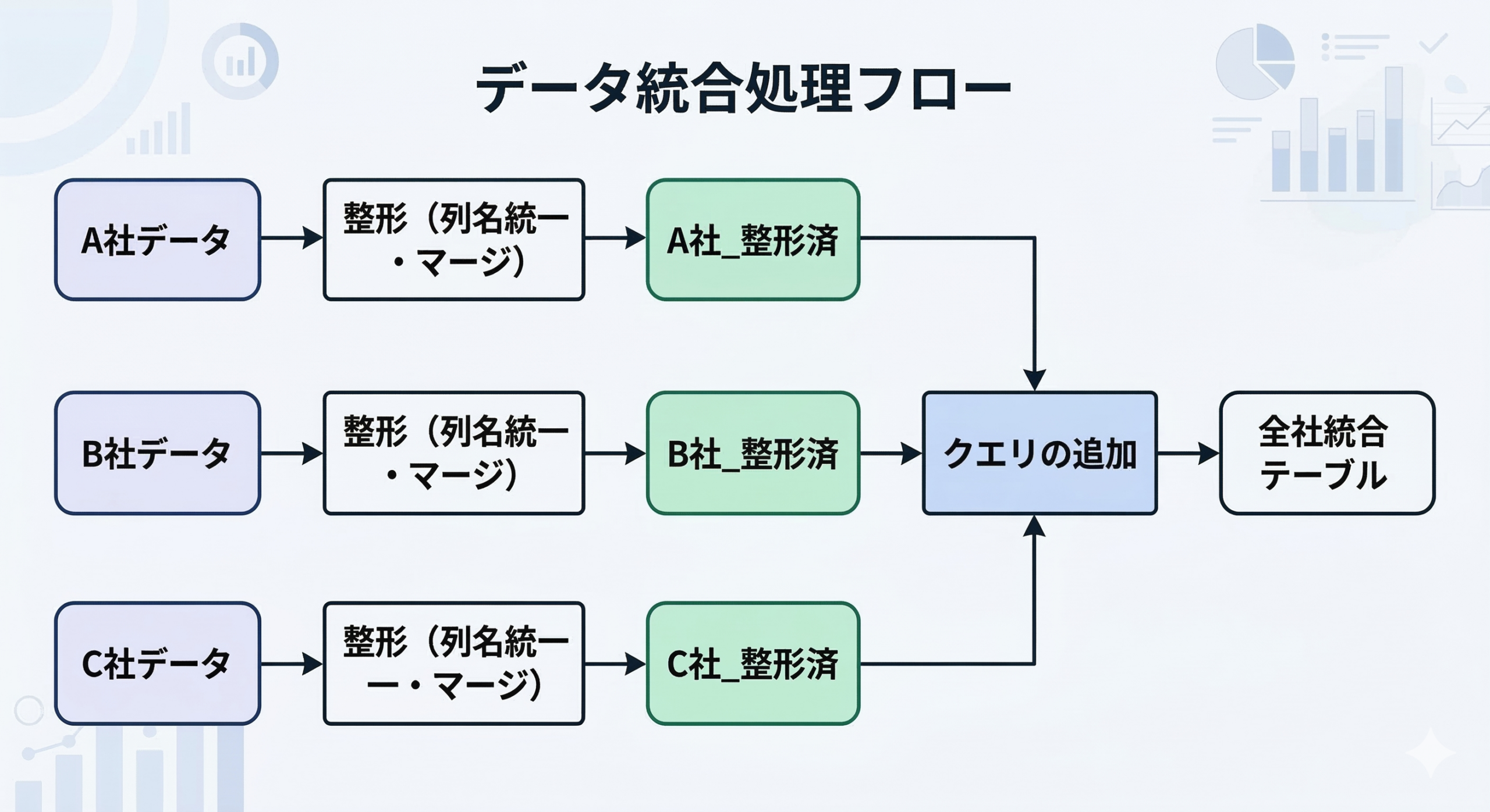 - 各社のクエリを「共通フォーマット」に整形する