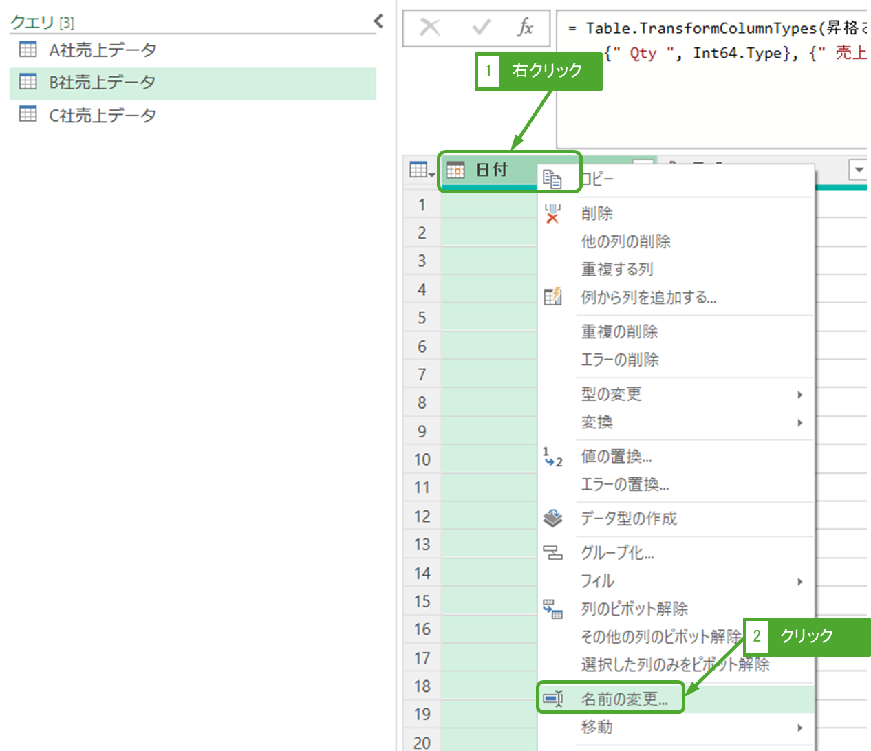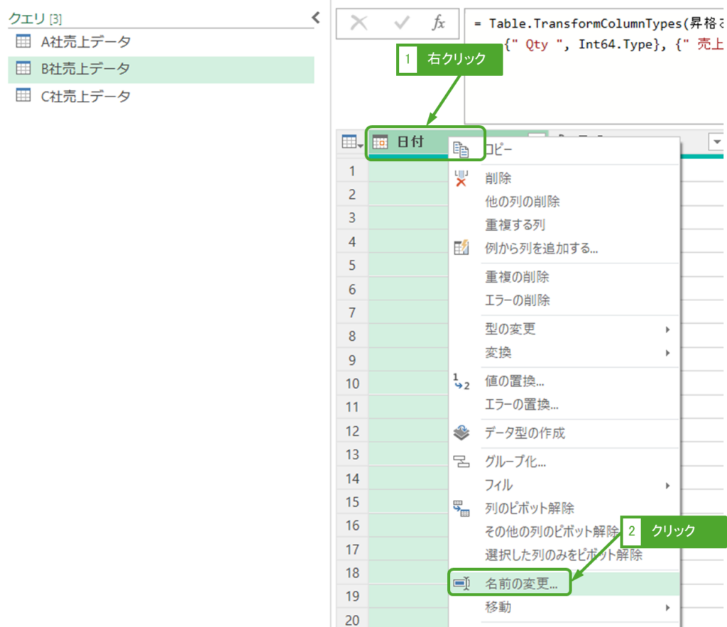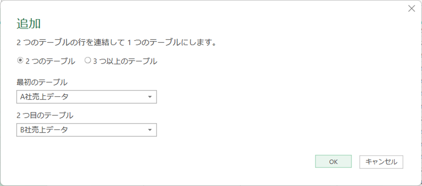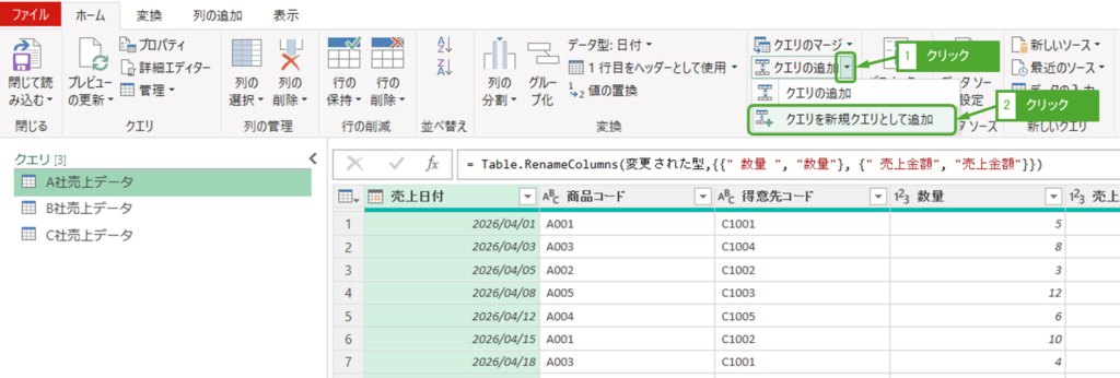 | クエリの追加 | 現在のクエリ(A社売上データ)に直接他の会社分が追加される | A社売上データクエリを上書きしてよい場合 |