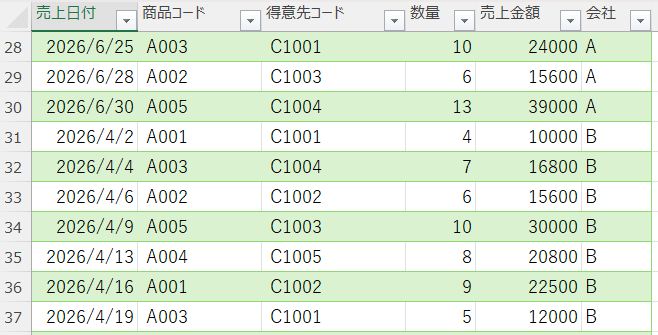 A社、B社、C社のデータが縦に結合されたデータがExcelシートに出力されます。