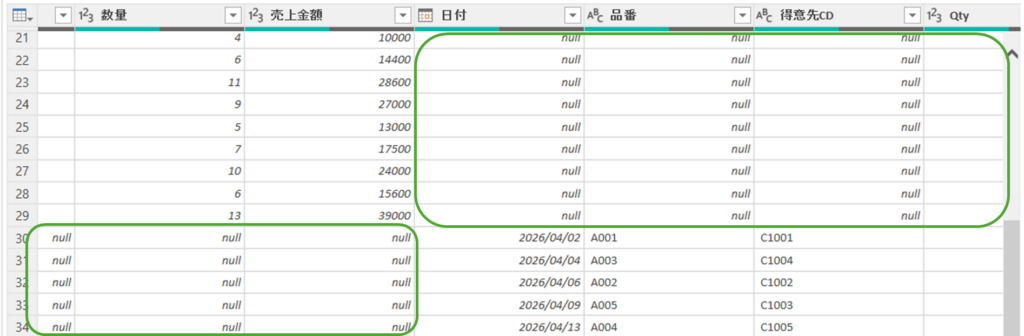 列名がバラバラのクエリを縦結合しても、列名が違うと同じ列と認識されずに、列がバラバラになります。バラバラになった