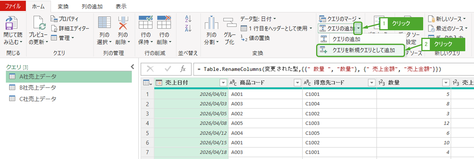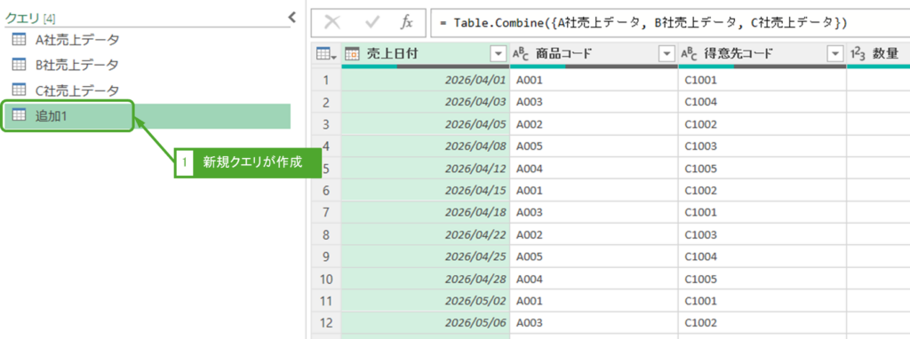 「追加1」という名前の新しいクエリが作成され、A社、B社、C社のデータが縦に結合されたテーブルが表示されます。クエリの名前は任意で変更可能です(例:「売上_統合」)。