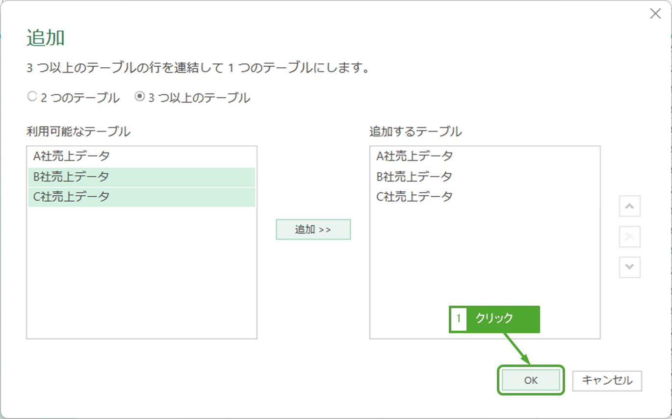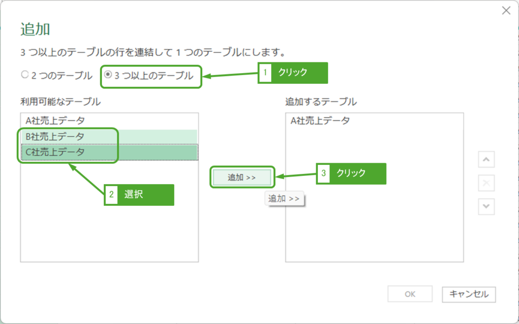 「3つ以上のテーブル」をクリックします。利用可能なテーブルにB社、C社売上データを選択し、「追加」ボタンをクリックします。